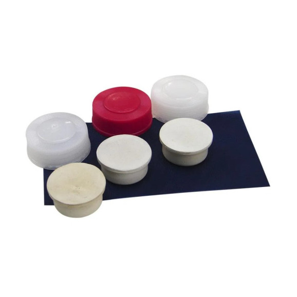A embalagem contém pequenos remendos de PVC, 1 tubo de cola vinílica, 3 rolhas de borracha e 3 tampas.